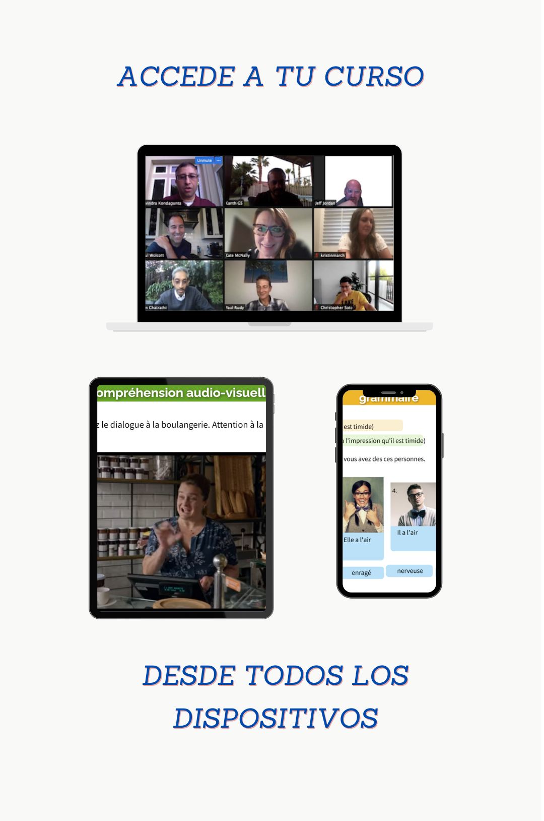 En principio aprenderás de manera autónoma con la plataforma interactiva, y luego contarás con un club de conversación en vivo vía Zoom para reforzar tus aprendizajes en gramática, pronunciación, conversación y más. Y para certificarte tendrás talleres en vivo de preparación a los exámenes internacionales DELF B2, TCF y TEF.